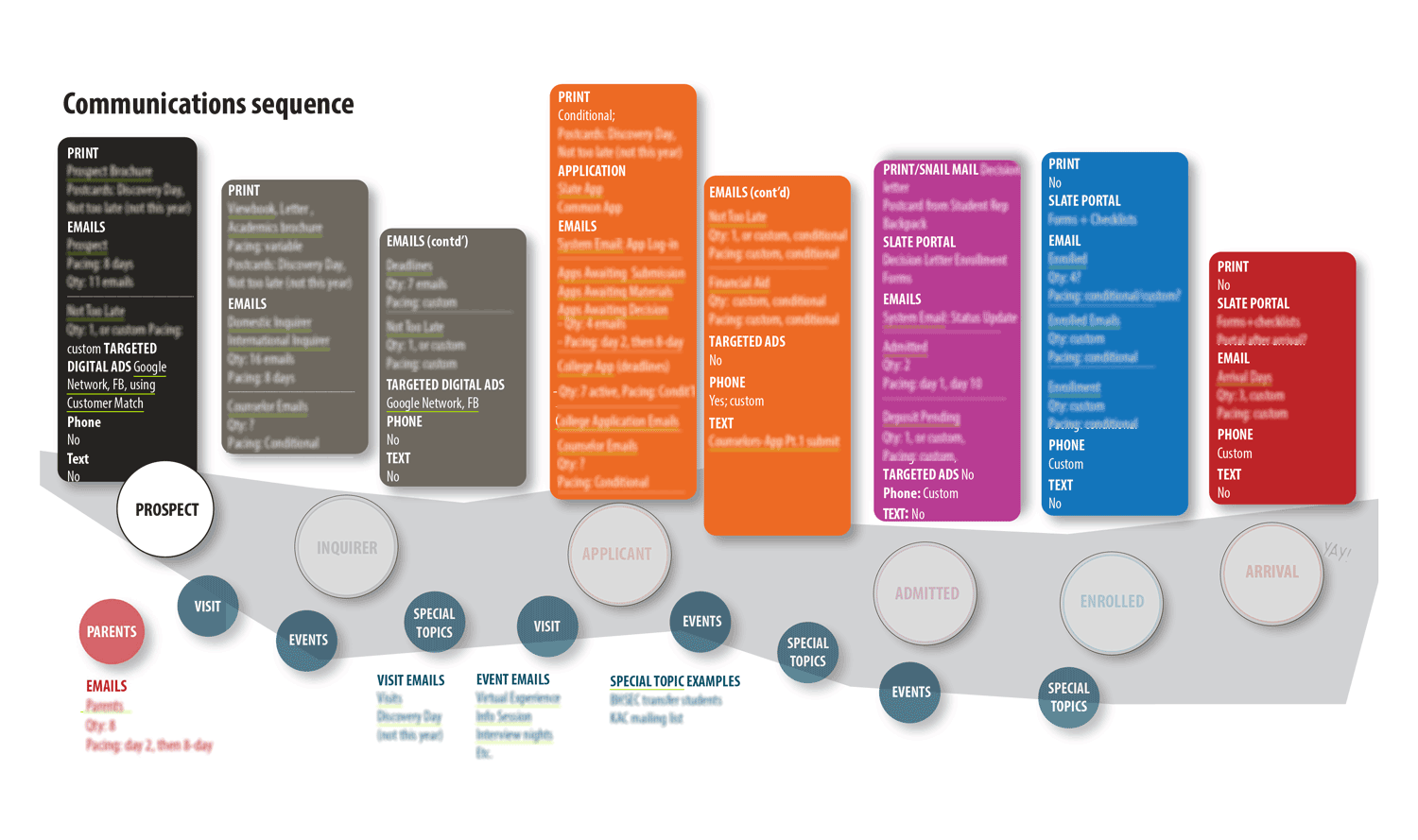 Created visual overview of entire multi-channel communications landscape, mapping the customer journey for prospective Simon’s Rock students. This allowed our teams to identify areas for improved strategy and efficient workflows. Modes of communication included print collateral, HTML email sequences, counselor emails, visits, parent emails, etc. Redesigned print brochures and email marketing sequences.